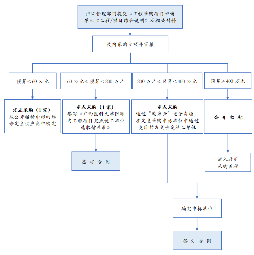 工程项目的归口部门有:后勤基建处、专门设立的建设管理部门、信息中心、保卫处等。